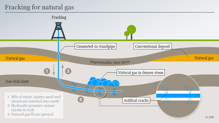 Fracking is known as hydraulic fracturing which is essentially applying pressure to the source rock by using water, gas and other chemicals. This works by digging underneath the ground so that water and sand can travel to the impermeable rock (oil/gas cannot escape from this rock) where the shale gas is present. This is through a vertical or angled pipe which would be 1 mile beneath the Earth. The water, gas and sand are injected at very high pressures which creates cracks and in turn allowing the shale gas to push upwards. So, where the shale gas was, has now been substituted by water and sand. The shale gas is pushed upwards and collected. As well, the water and sand are collected and taken away so that no living organisms will be affected in the area. I have added a diagram for you to get the gist of it!